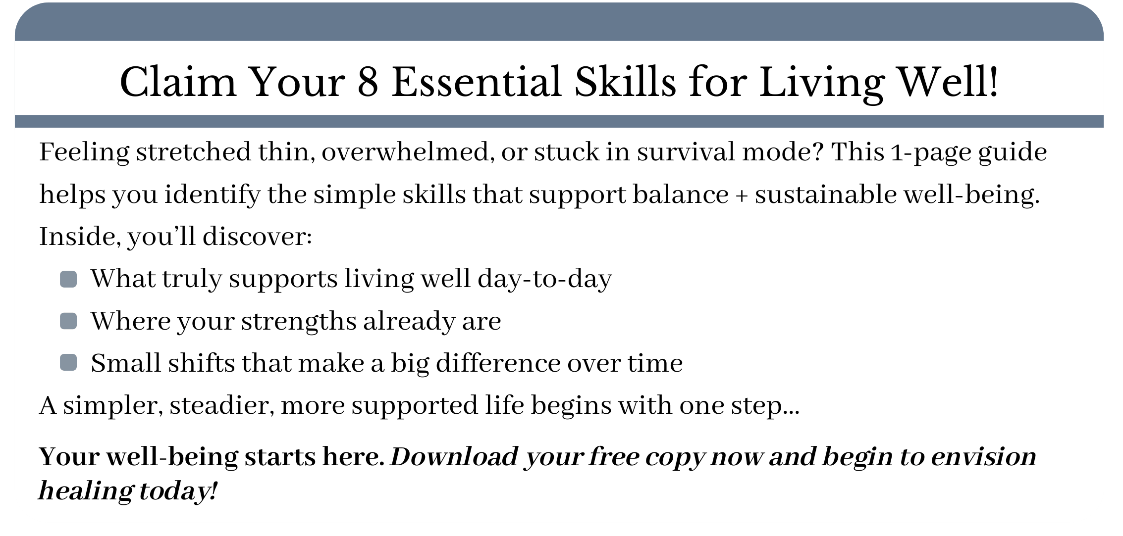 Feeling stretched thin, overwhelmed, or stuck in survival mode? This 1-page guide helps you identify the simple skills that support balance + sustainable well-being.